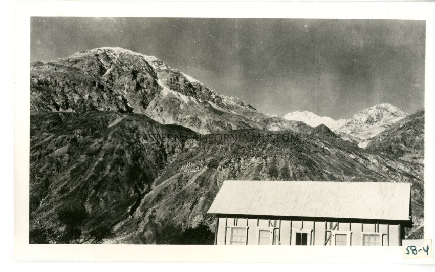 B/w photo of a building (barrack? housing?) with snow-capped mountains in the background.