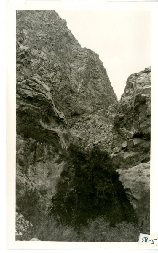 B/w photo of a mountainside with a large, dark patch of vegetation in the lower center.