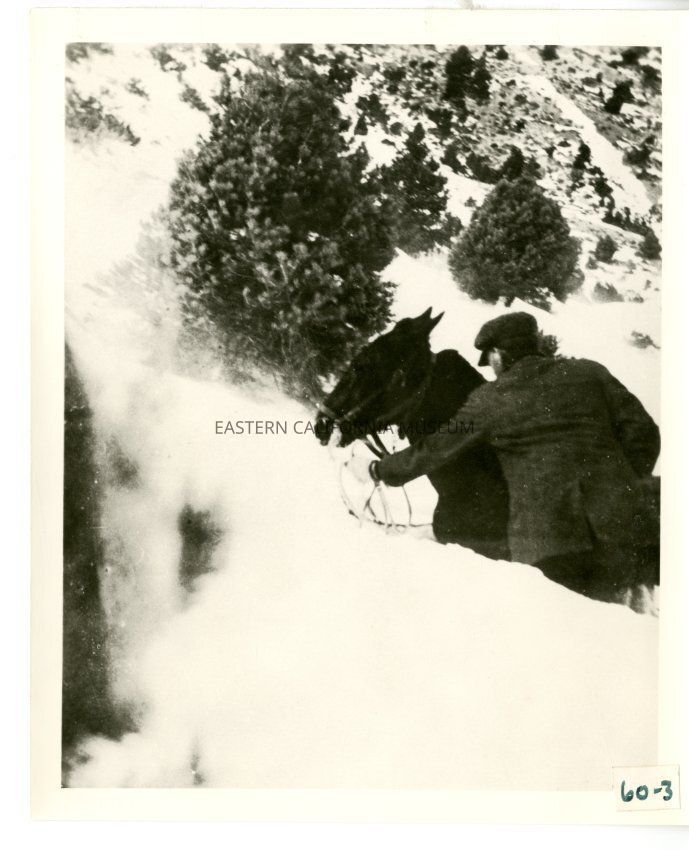 B/w photo of a man and a horse making their way uphill through deep snow.