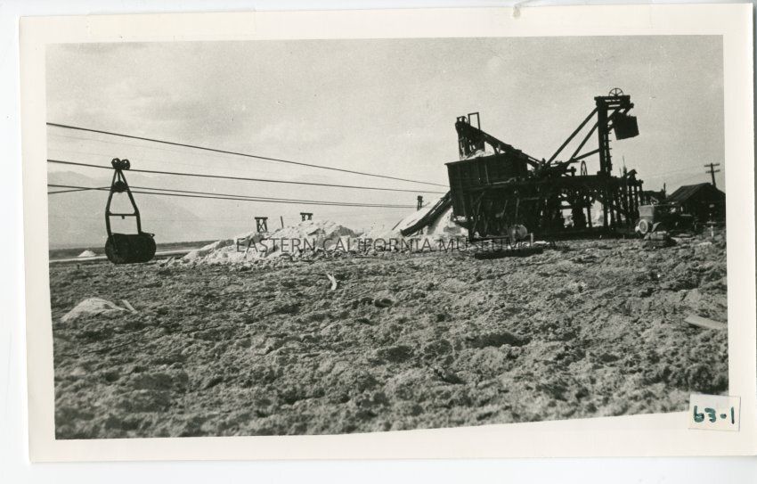 B/w photo of a tram tower, station, or terminal with a salt bucket on cable. Huge piles of salt in background. There is a vehicle in the right side along with power lines and a building.