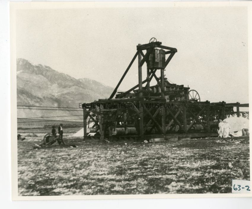 B/w photo of what appears to be a tram terminal. There are man salt buckets underneath the structure. Two people standing to the left.