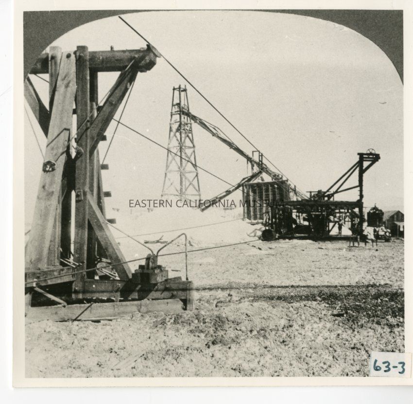 B/w photo of salt tram towers and cables, with a huge pile of salt in the background by what may be a conveyor belt? The picture seems to have rounded or arched top corners, like a stereoview.