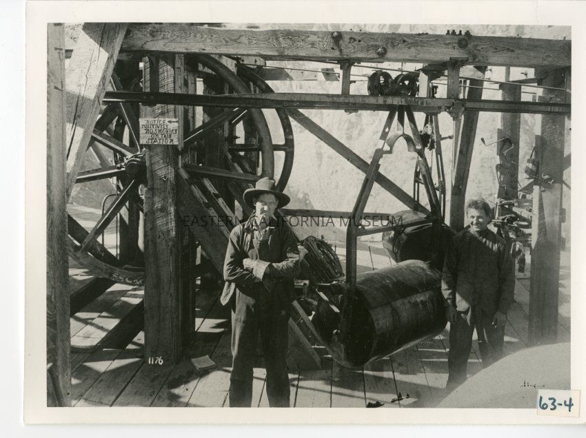 An article from the Inyo Register dated 08/31/1961 identifies the man on the right as August Serventi, a member of an Owens Valley pioneer family. The engineer on the right was unidentified.