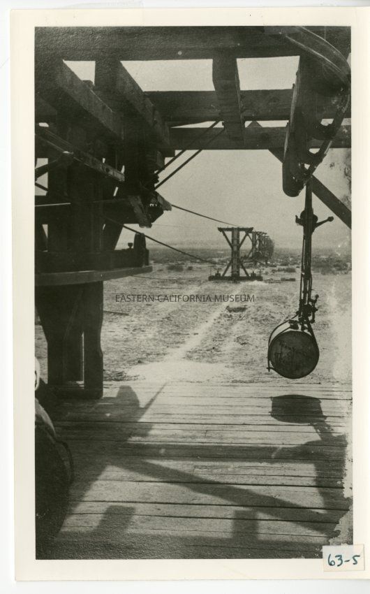 Label says: "Water bucket parked at loading terminal in Saline Valley. When the tram was operating, all water and food came in over the tram. Water buckets were parked at each control station and the station operators got water as needed from these buckets."