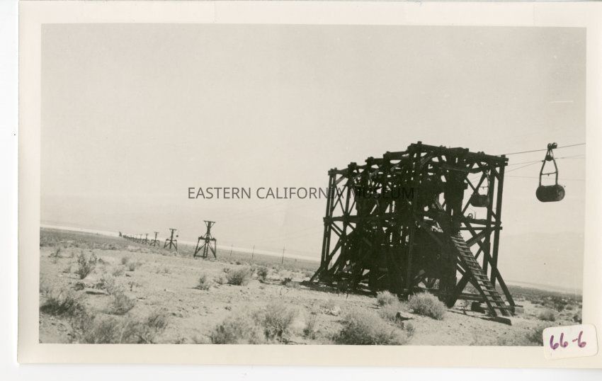 B/w photo of a tram tower or station. There is a salt bucket to the right and a line of tram towers stretching out into the distance across flat land.