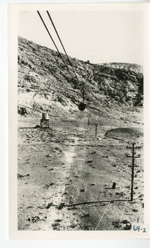 B/w photo taken from a high vantage point looking down at a salt bucket on cables and what appears to be a water tower on the ground and power lines.