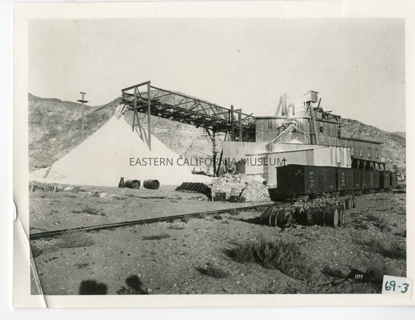 B/w photo of a wooden structure by a huge pile of salt. There are four Southern Pacific railroad boxcars in the foreground (the number on one is "319"). Barrels and bags on ground. Written in lower right, "1179."