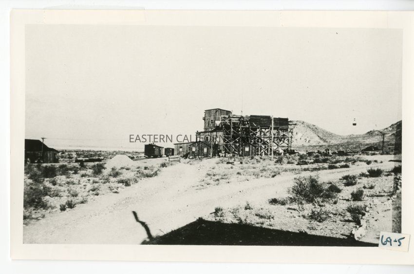 B/w photo of a large wooden structure, likely the tram terminal. There is a salt bucket on cables in the right side and a power line on the left side. Appears to be a couple of boxcars (maybe Southern Pacific?) on rails.