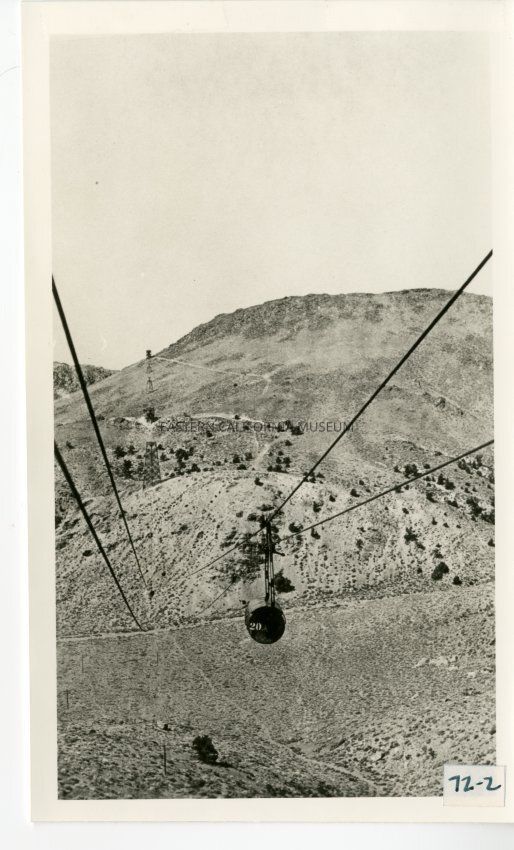 B/w photo of a salt bucket with "20" stenciled on it going up (or down?) along cables.