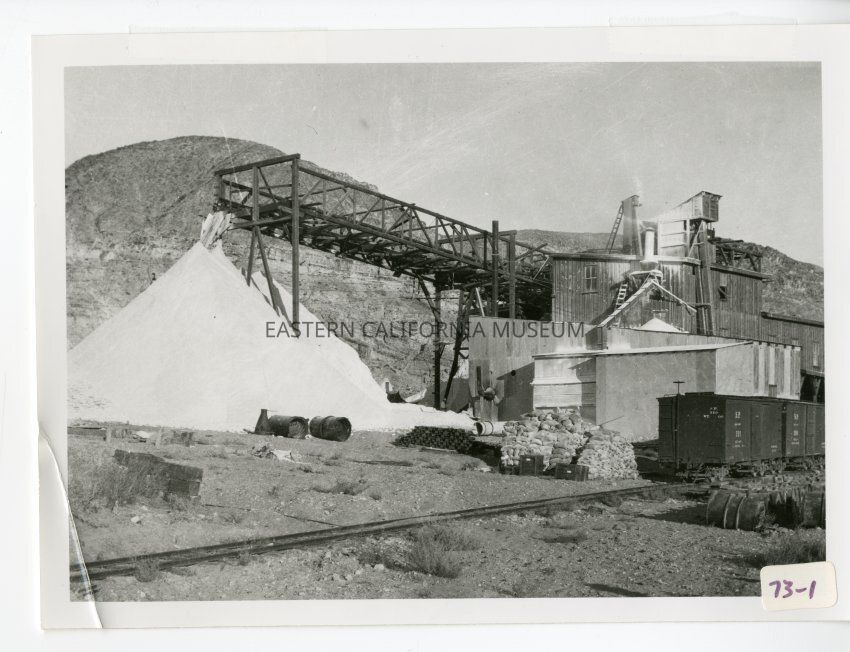 B/w photo of a wooden structure by a huge pile of salt. There are four Southern Pacific railroad boxcars in the foreground (the number on one is "319"). Barrels and bags on ground.