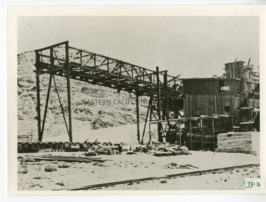 B/w photo of a wooden structure with a long section protruding (conveyor belt?). Row of barrels beneath this protrusion and rail in foreground.