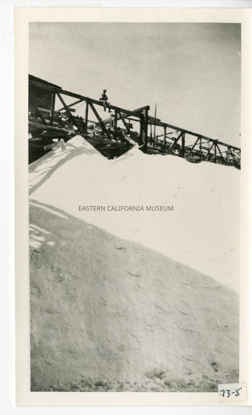 B/w photo of a person sitting on a wooden structure (conveyor belt?). There is a huge pile of salt in the foreground.