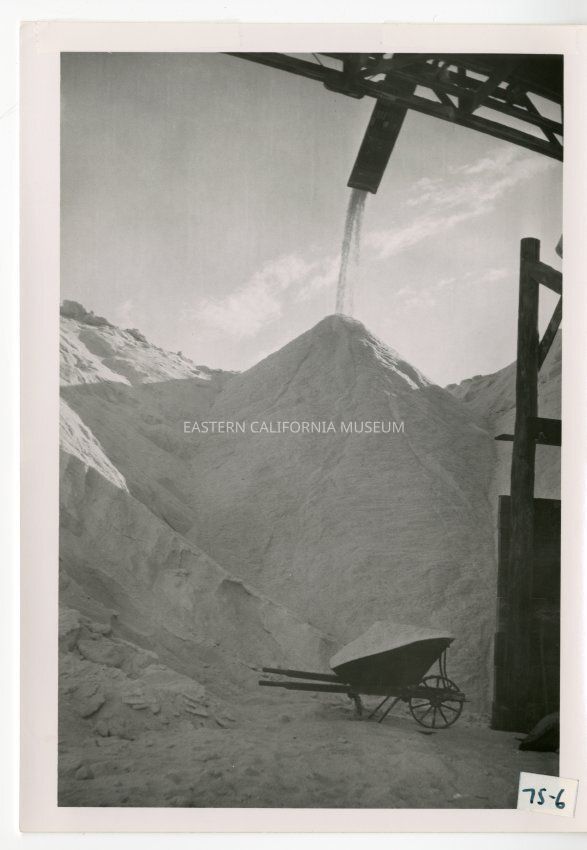 B/w photo taken from underneath the horizontal part (conveyor belt?) of the wooden structure (tram terminal?) in previous photos. Full wheelbarrow and huge piles of salt in front. There appears to be a sort of sluice that funnels the salt down.