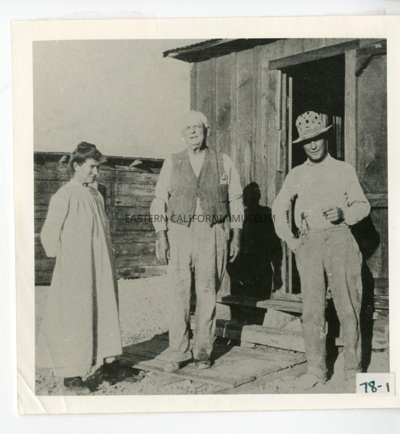 B/w photo of three people (two men and a woman) standing front of a wooden building. The door is open behind them. These are the same people in photo 2010.12.1.38c.