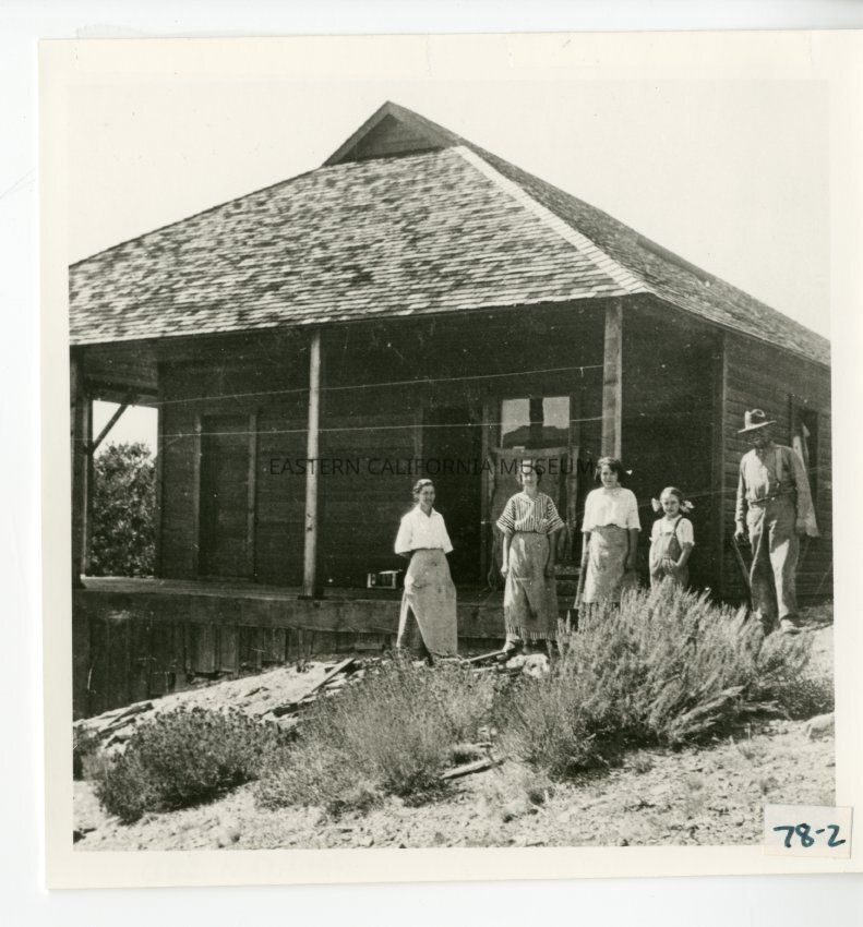 B/w photo of five people (three women, a man, and a young girl) standing in front of a wooden house.