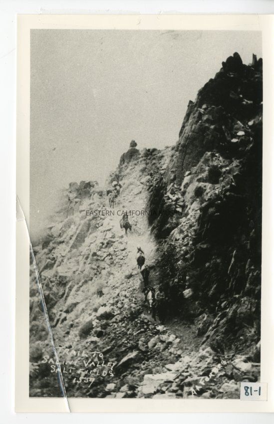 B/w photo of several men on horseback and mules coming down a steep, rocky trail. Writing on front: "Trail to Saline Valley Salt Fields" and "1559" and "A. A. Forbes."