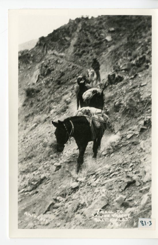 B/w photo of several men on horseback and mules coming down a steep, rocky trail. Writing on front: "Trail to Saline Valley Salt Fields" and "A. A. Forbes."
