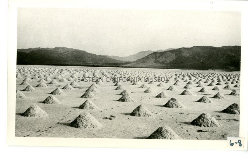Label says: "The Saline Valley salt fields with a crop of salt ready for harvest. The salt piles were arranged in rows approximately twelve feet apart with the spacing between piles being about six feet. View is looking southeast with the Panamint Mountains on the left and the Nelson Range of the Inyo Mountains on the right."