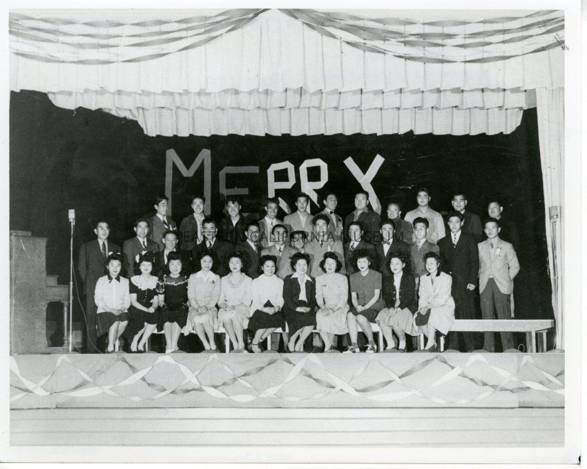 Black and white photograph of a group of young people (students?) on the stage at Manzanar War Relocation Center. They may be from a social club or some other organized group. The sign behind them says "Merry [X-Mas or Christmas?]."