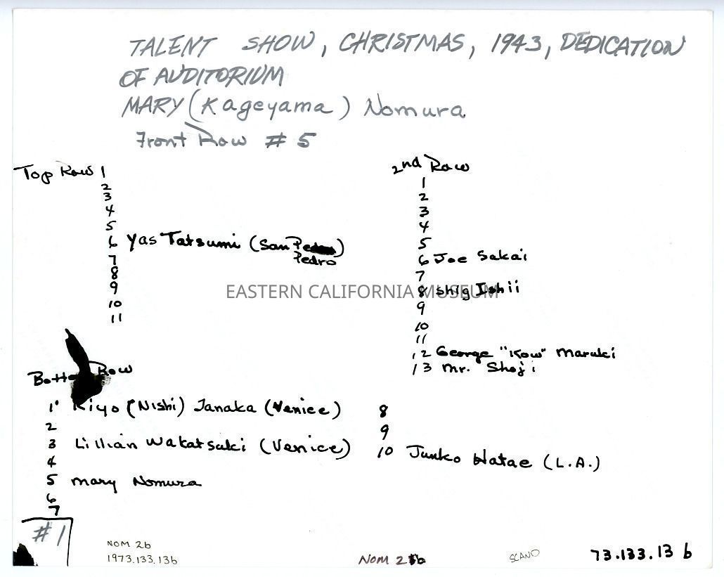Written in black ink on reverse: #1. Talent Show, Christmas 1943, Dedication of Auditorium, Mary Kageyama Nomura front row #5.
