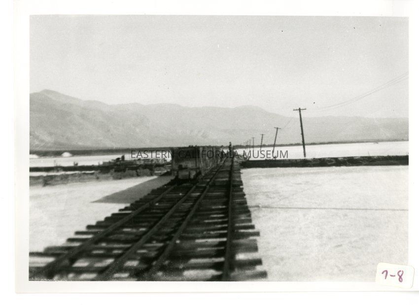 B/w photo of salt carts on rails with power lines and mountains in background.