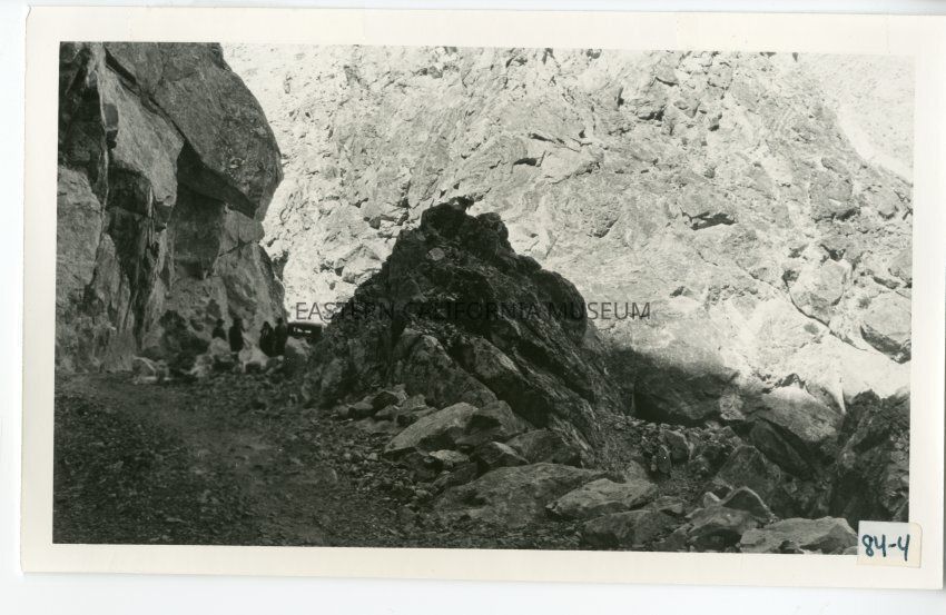 B/w photo of four men standing by a vehicle on a dirt road in a rocky canyon or mountainside.