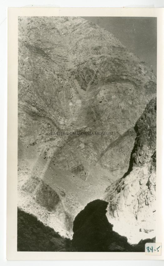 B/w photo of a dirt road at the bottom of a rocky canyon.
