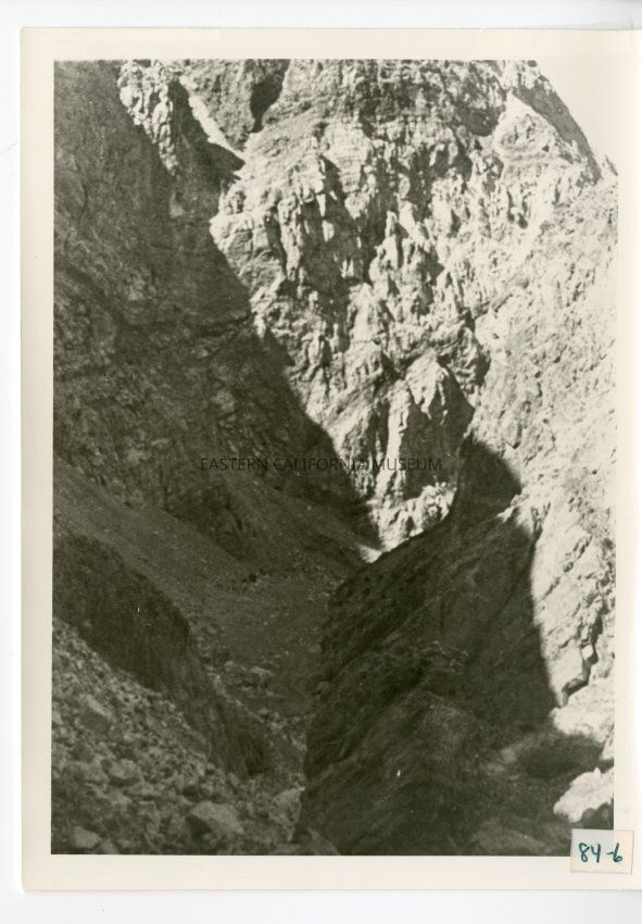 B/w photo of a dirt road at the bottom of a rocky canyon.