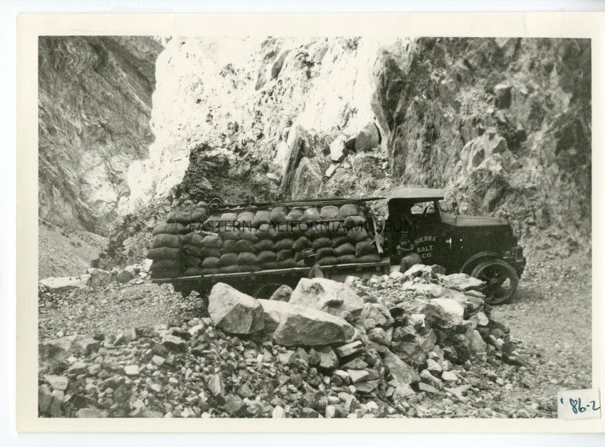 B/w photo of a truck hauling many bags (likely salt) along a dirt road. There is a man in the truck and two men standing beside it. Written on the door is, "Sierra Salt Co." There's a wheeled ladder piece of equpiment on top of the piled bags.