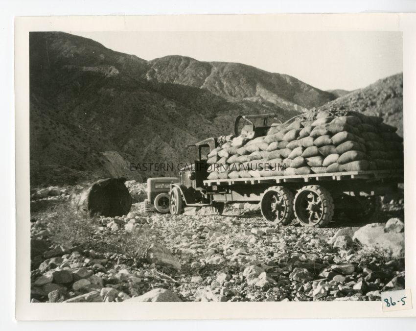 B/w photo of a truck hauling many bags (likely salt) along a dirt road. There is a smaller vehicle in front of the truck.