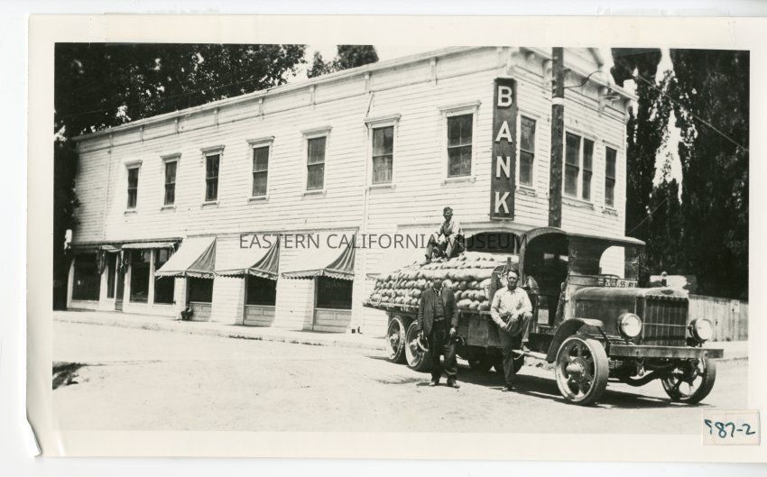 B/w photo of a truck loaded with bags (likely salt) parked in front of a bank building in a town or city (Bishop?). There is one man sitting on top of the piled bags and two men standing in front of the truck.