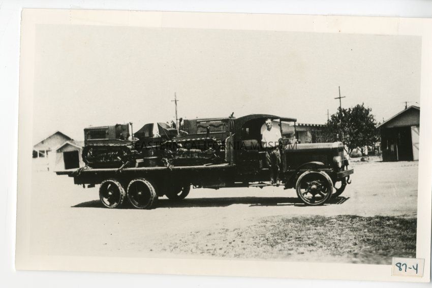 Label says: "Two caterpillar tractors on a six cylindar Moreland truck on way to Saline Valley. Equipment purchased by contractor C. W. Hayes for harvesting and hauling salt for Sierra Salt Company. Photo probably taken in 1926."