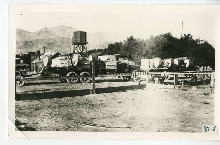 B/w photo of two tucks loaded with barrels and other unidentifiable equipment. Water tower in background, wooden fence in foreground.