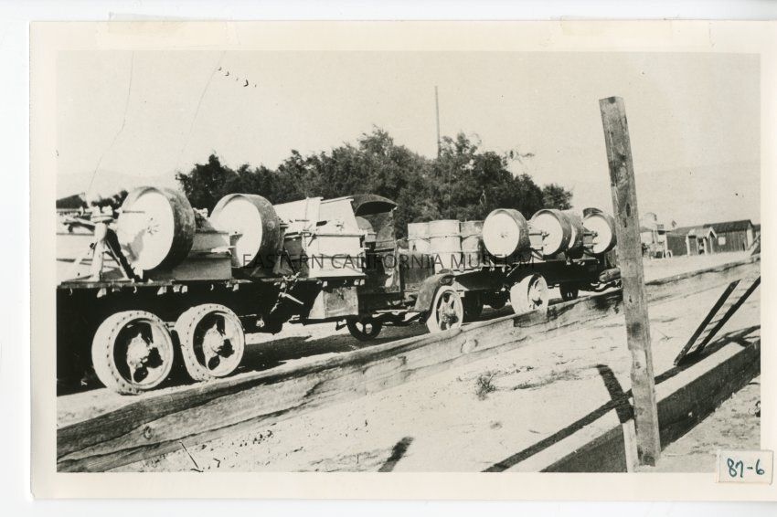 B/w photo of two tucks loaded with barrels and other unidentifiable equipment. Wooden fence in foreground, row of buildings (storefronts?) in distance.