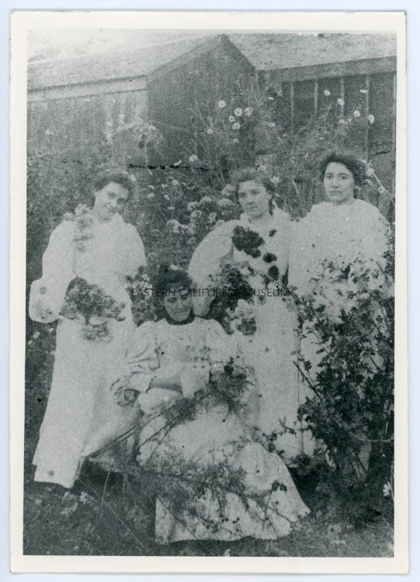 Old interpretative label says: Four Meysan girls in garden. North of the store and residence at Lone Pine. Left to right: Stella Meysan, Adeline Meysan, Eugenie Meysan, and Blanche Meysan (seated).