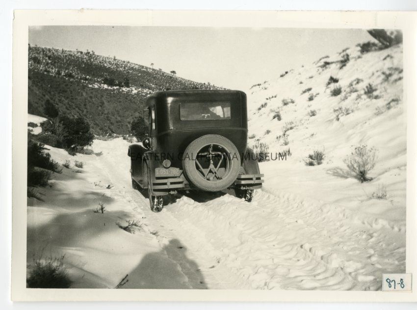 B/w photo of a vehicle druing along a snowy road. License plate is "1 051 782."