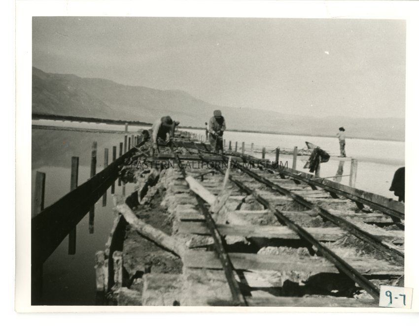 B/w photo of two men working on rails across salt flats and brine with mountains and one or two other men in background.
