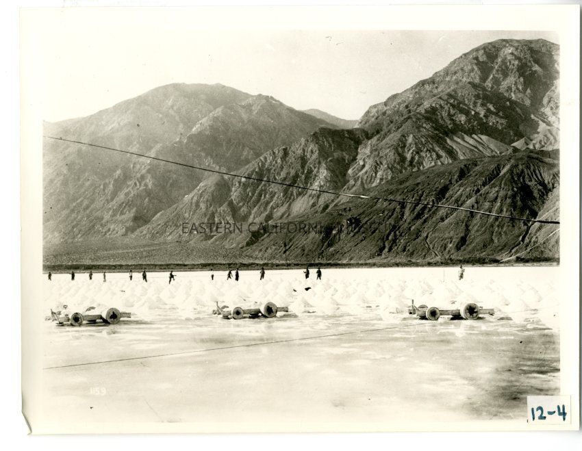 B/w photo of fourteen men working amongst salt piles. Three "buggies" in foreground. There is a noticable line or cable stretching across the photograph (it is reflected in the brine). Mountains in the background.