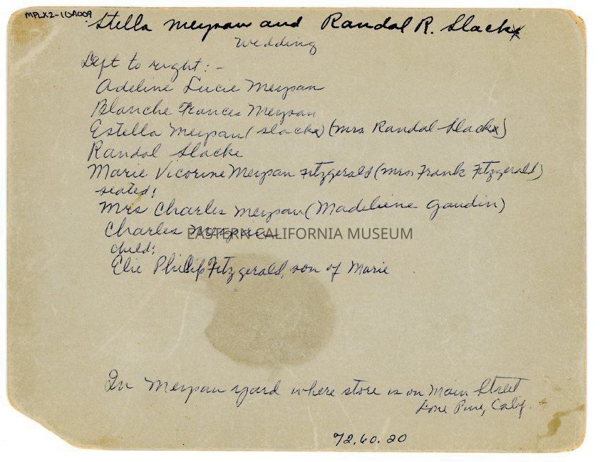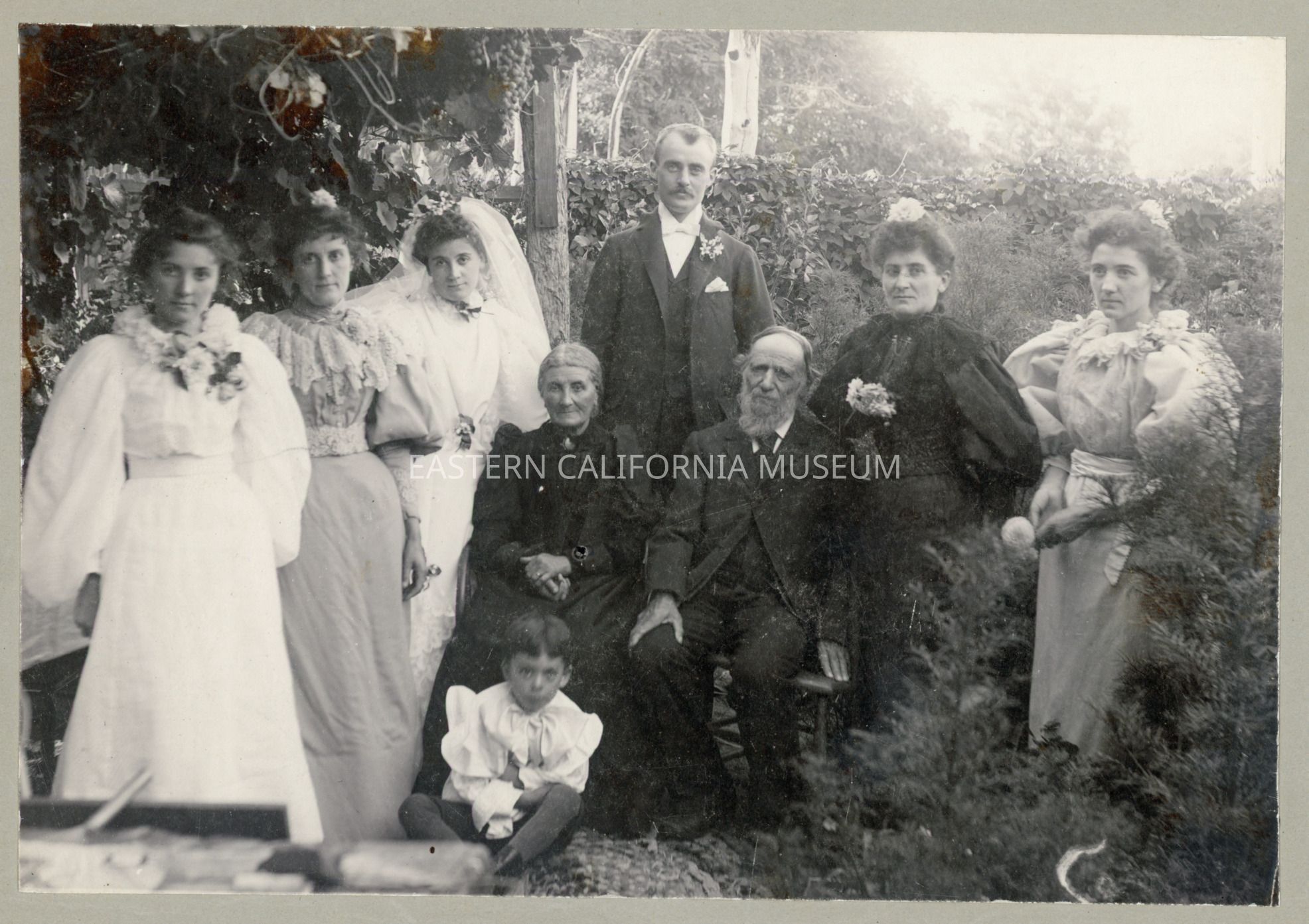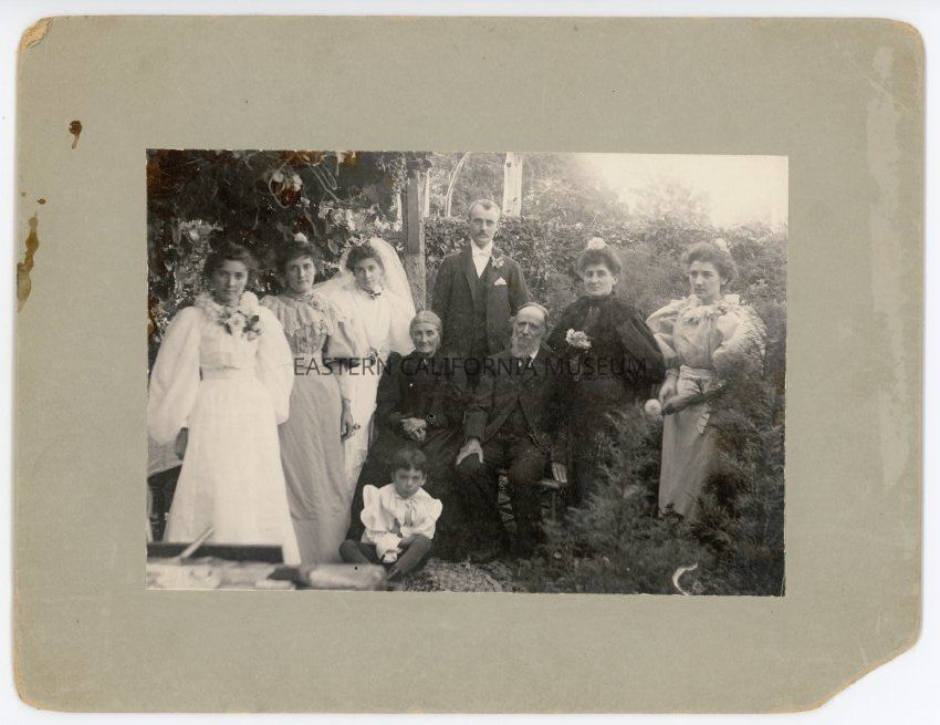 Old interpretative label says: Wedding of Stella Meysan and Randal R. Slack. August 27, 1896. Picture taken by Alfred W. De La Cour Carroll in Meysan garden at Lone Pine, California. (The Meysan Store building is now "La Florista" Flower Shop.) Left to right standing: Adeline Lucie Meysan, Mrs. Thomas Boland (Blanche Frances Meysan), Mrs. Randal R. Slack (Stella Meysan), Randal R. Slack, Mrs. Frank Fitzgerald (Marie Victorine Meysan), Eugenie Meysan. Seated: Mrs. Charles Meysan (Madeline Gaudin), Charles Meysan, Elie P. Fitzgerald, son of Marie.Made/Created