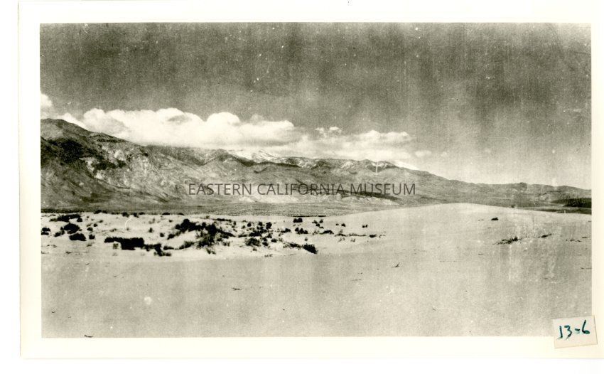 B/w photo of sand dunes, scrub vegetation, mountains, and clouds. Doesn't appear to be the salt flats area, maybe elsewhere in Saline Valley?