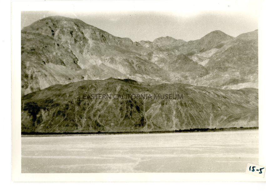 B/w photo of mountains. Possibly salt flats in foreground.