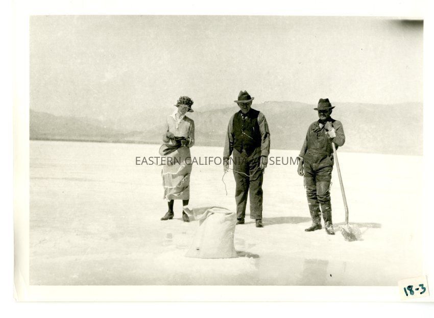 B/w photo of a woman and two men posing next to a small bag of salt out in the salt flats and brine.