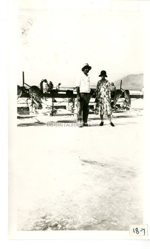 Label says: "G. W. Russell, President of Sierra Salt Co., and probaly Mrs. Russell in front of portable monorail, about 1930."