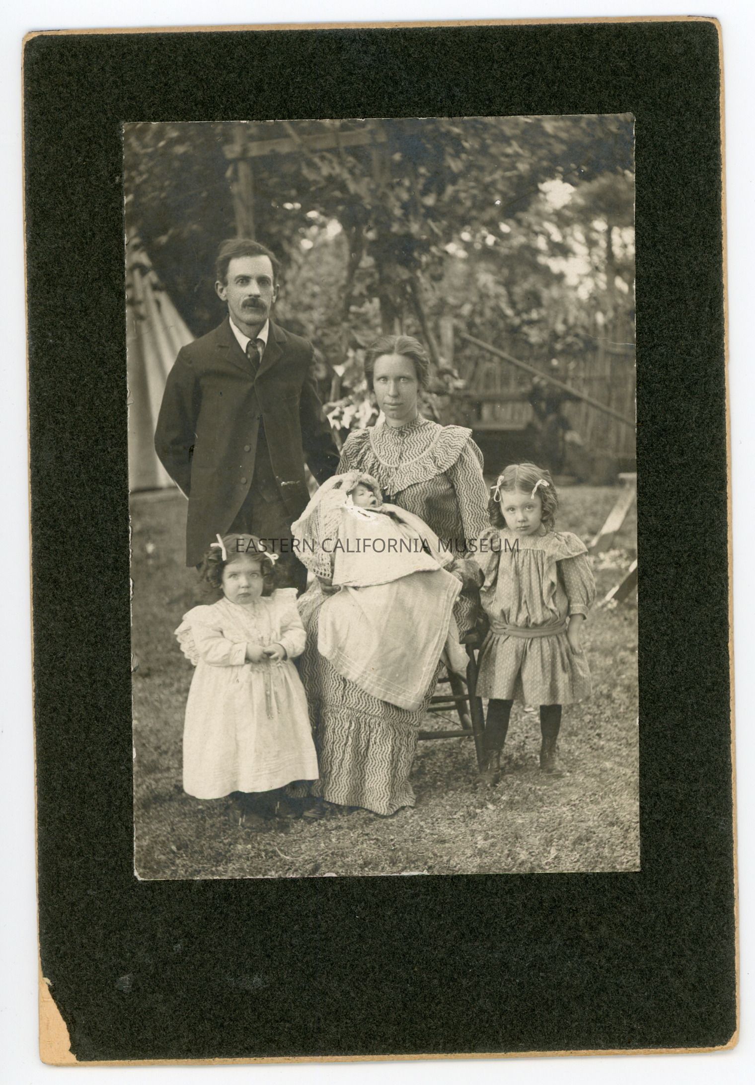Old interpretative label says: Felix P. Meysan Family. June 1905. Left to right: Felix Philip Meysan, Mrs. Fleix P. Meysan (Martha Ellen Hancock), Zelia Adeline Meysan, Charles Meysan (baby). Left: Elodie Mary Meysan. Felix P. Meysan was the only son in ten children. Came to Lone Pine when he was four years old in 1869 and resided all his life in Lone Pine.
