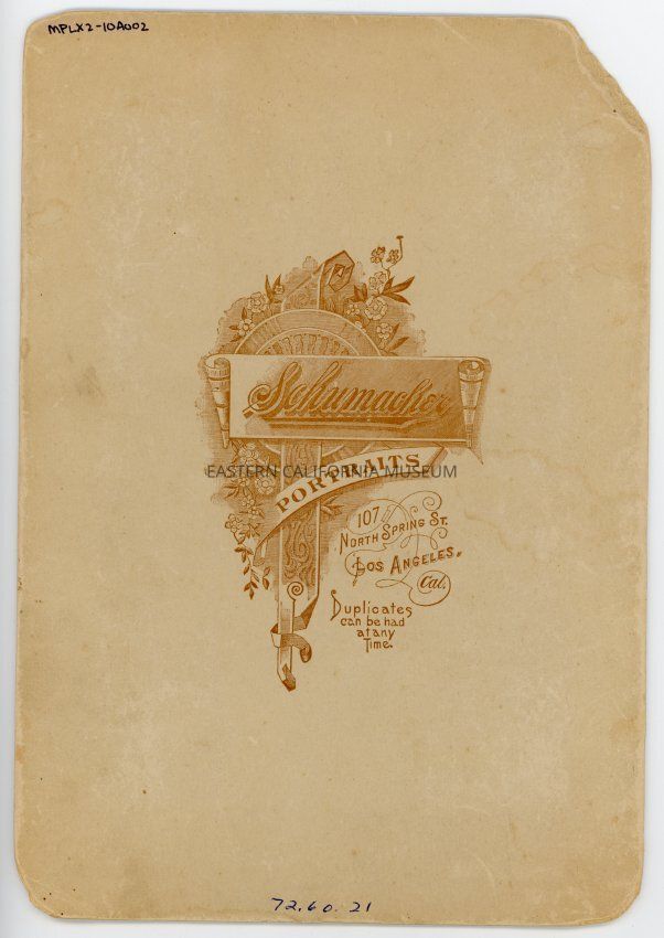 Mounted studio portrait of a seated man and woman. Photographer was Schumacher of Los Angeles. The mount also says, "Paris Panel."