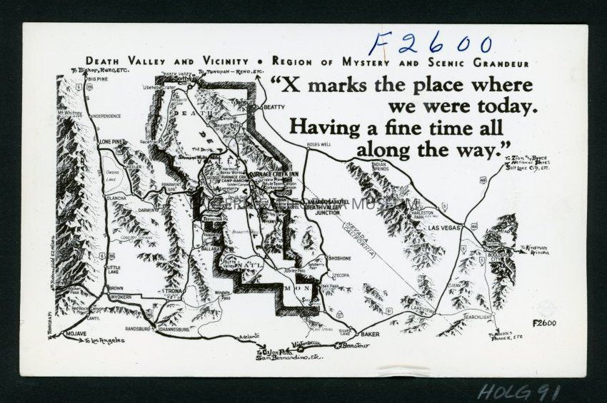 Death Valley and Vicinity -- Region of Mystery and Scenic Grandeur -- "X marks the place where we were today. Having a fine time all along the way."