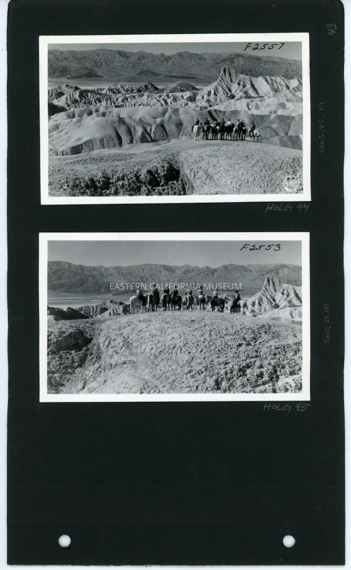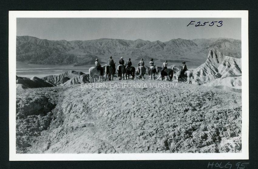 This is a photo of a group of people on horseback looking out at rock formations in Death Valley. The riders' backs are to the camera so you can't see any faces.