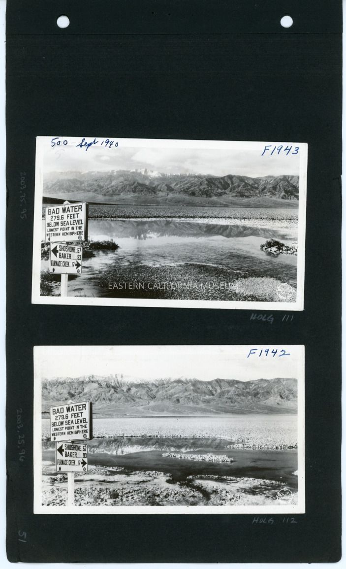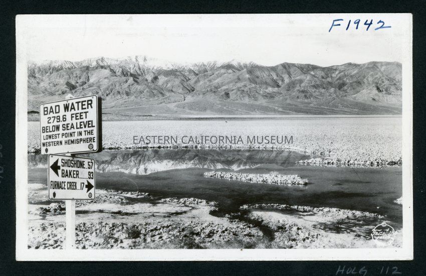 This is a photo of the signpost at Bad Water. It says, "Bad Water 279.6 Feet Below Sea Level Lowest Point in the Western Hemisphere." The sign beneath it gives distances to Shoshone, Baker, and Furnace Creek.