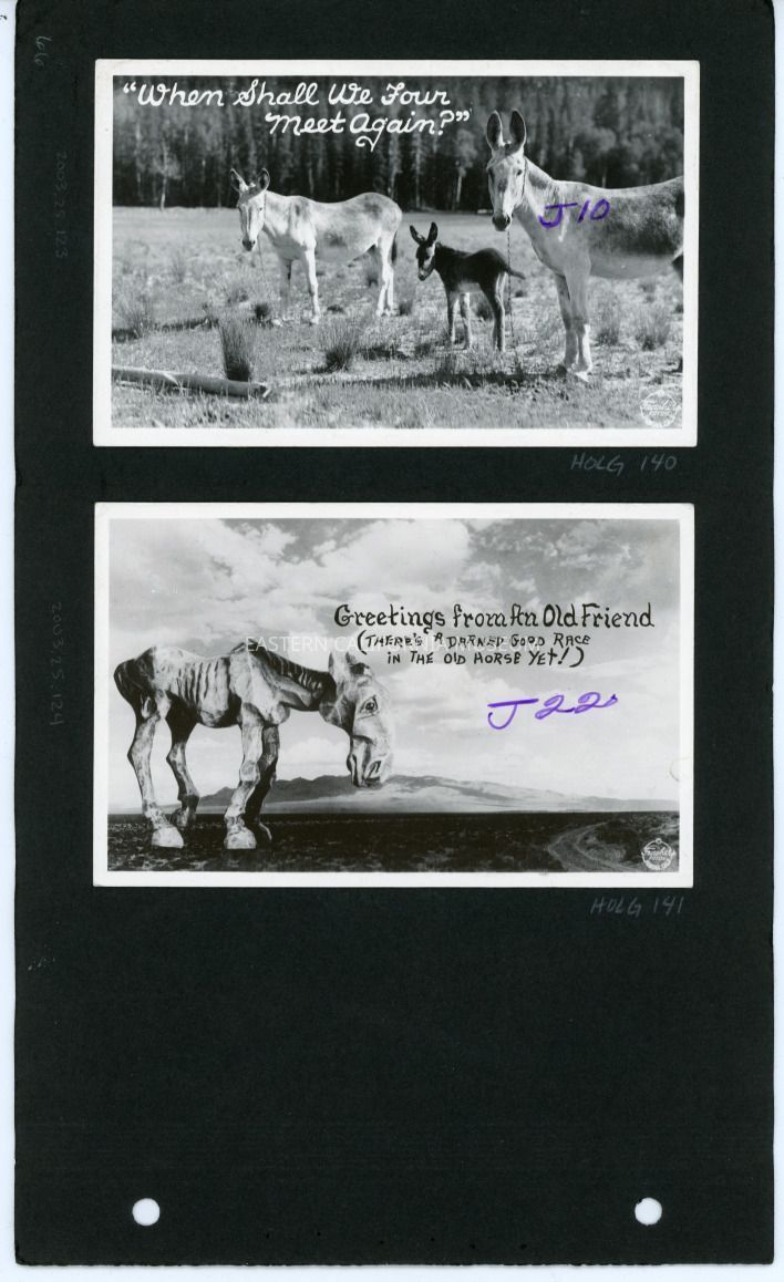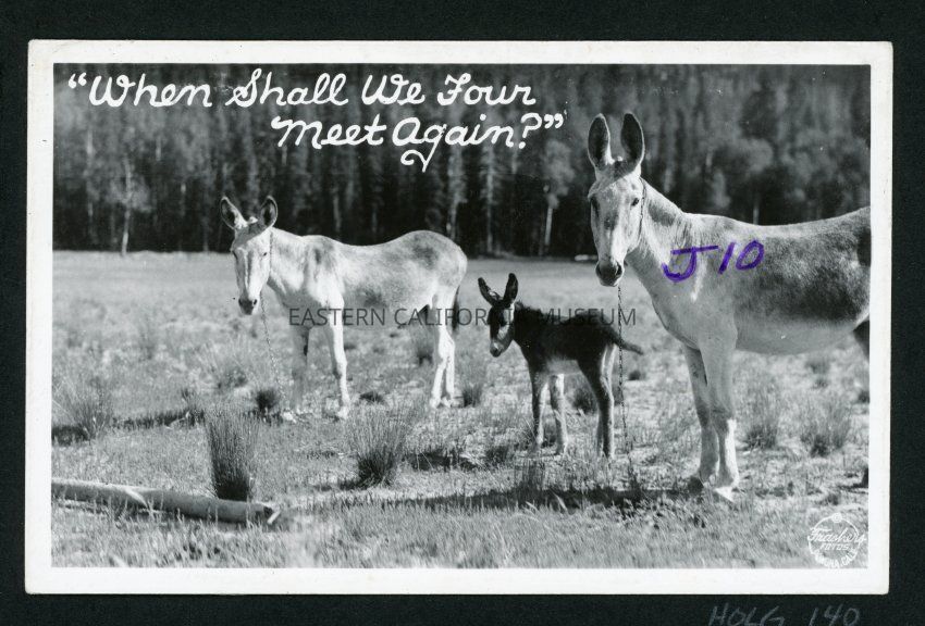"When shall we four meet again?" J10 Copyright Frashers Fotos Pomona Calif. This photo is of three mules or burros.