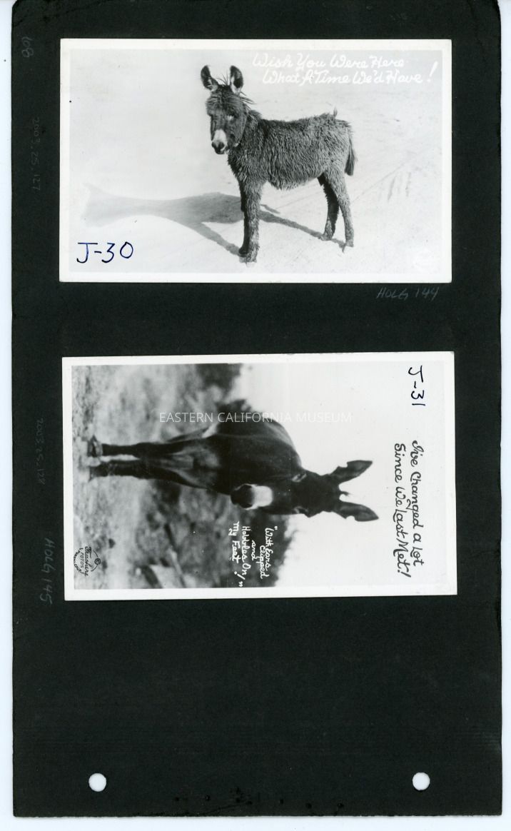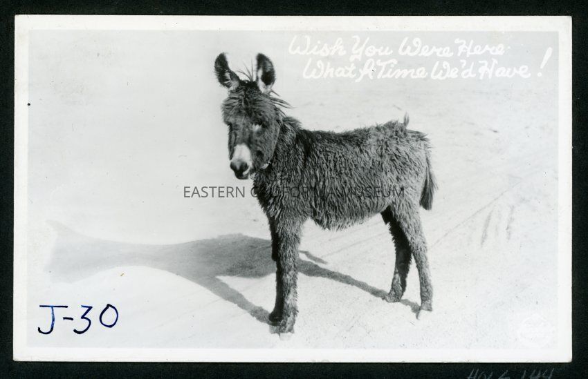 Wish you were here what a time we'd have! J30 Copyright Frashers Fotos Pomona Calif. This is a photo of a donkey or burro.